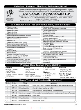 Head Office: 304, Western Edge - 1, Above Metro Store, Western Express Highway, Borivali (E), Mumbai - 400066. 1 MCT 1019 Highly active catalyst Nitro to amino, oxime to amine, less dehydrogenation e.g., Lisinopril, Meberamine